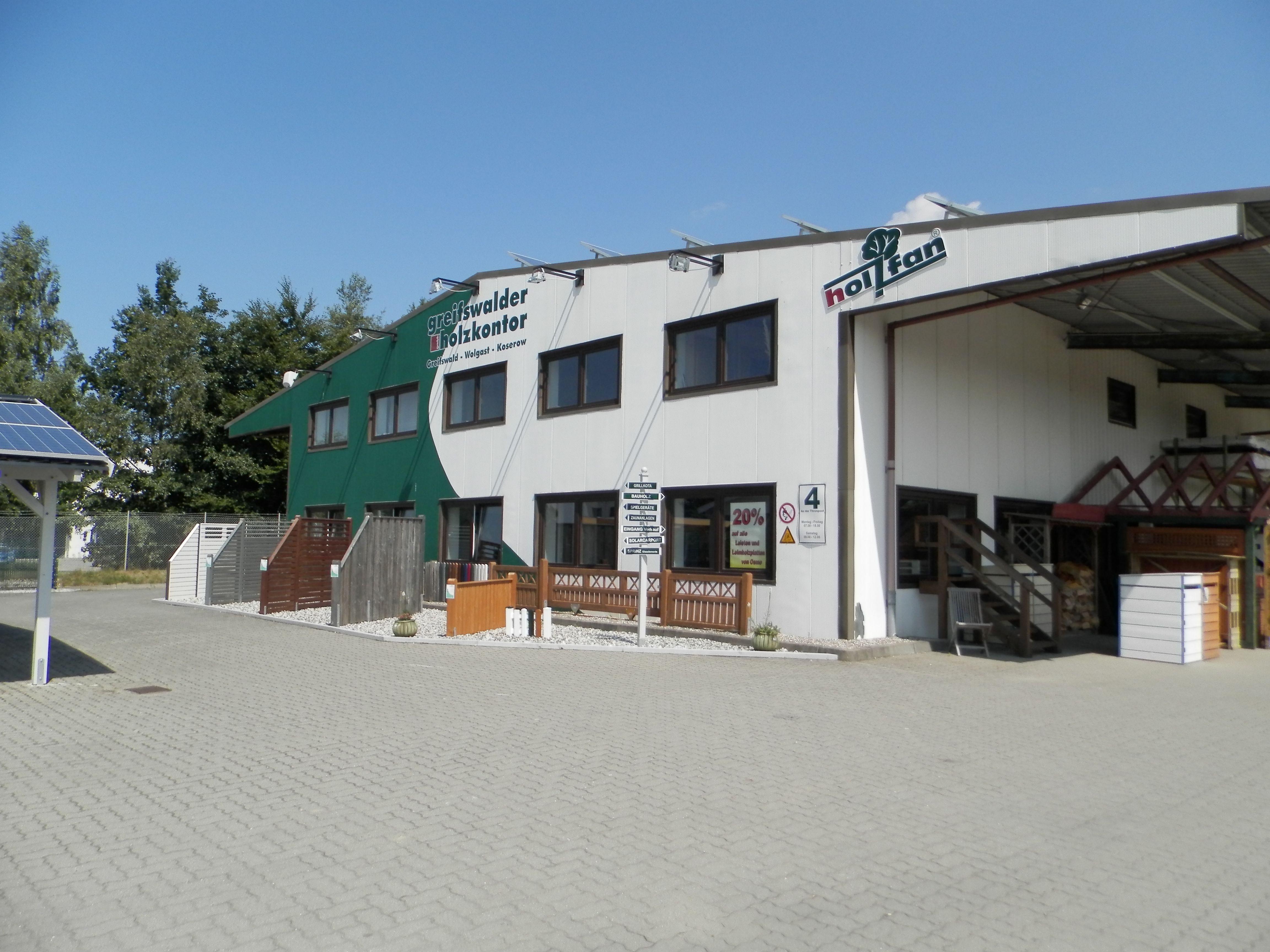 Im Stammsitz in Greifswald sind es besonders die Bereiche Carports, Terrassen und Gartenholz (Gartenhäuser, Zäune, Tore, Sichtschutz), die mit einer Musterausstellung angeboten werden.